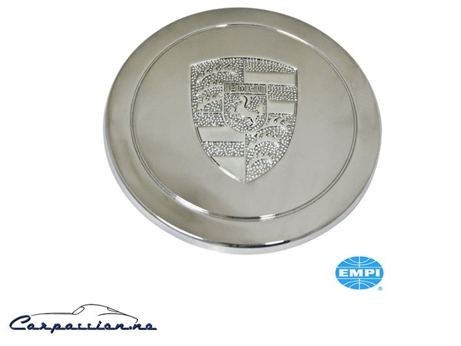 Navkapsel med Empi-logo som simulerer Porsche logo, laget av rustfritt stål og forkrommet for ekstra glans. Passer til Porsche 911 design felger. Denne navkapselen gir et stilrent og klassisk utseende til din bil. Perfekt for bilentusiaster!