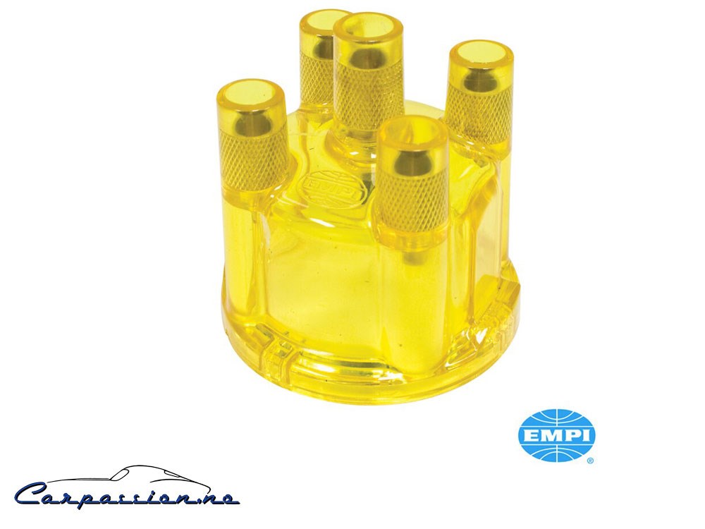 EMPI merke fordelerlokk, gult, gjennomsiktig. Passer Bosch og Empi fordelere, produsert av Empi