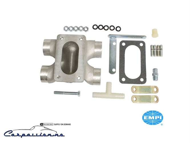 EMPI merke progressiv innsugmanifoldsett med rør og brakett. For EMPI EPC 32/36F og Weber 32/36 DFEV , produsert av Empi